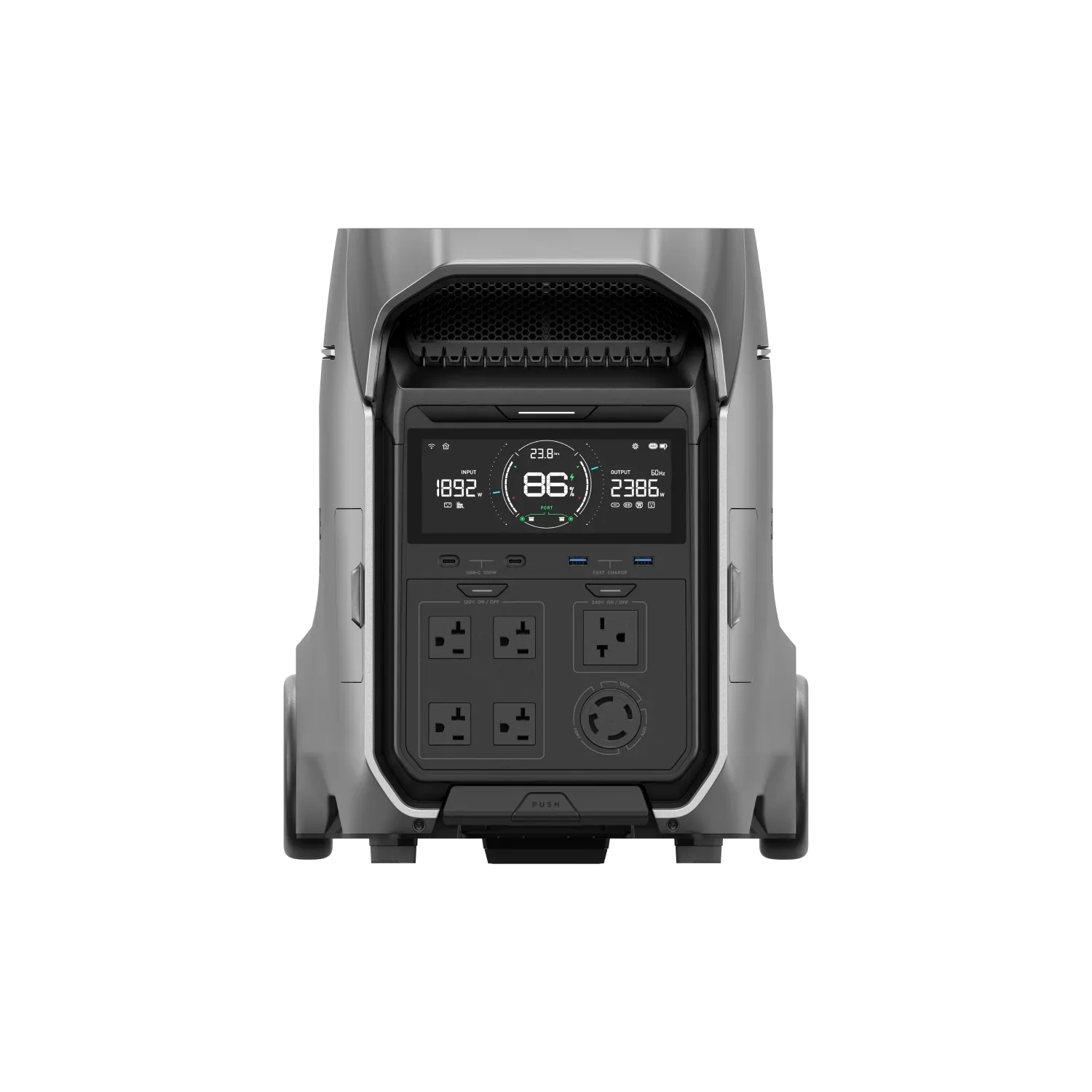 Simply connect the built-in NEMA L14-30R split-phase socket with the Inlet Box to power 120V/240V home appliances.